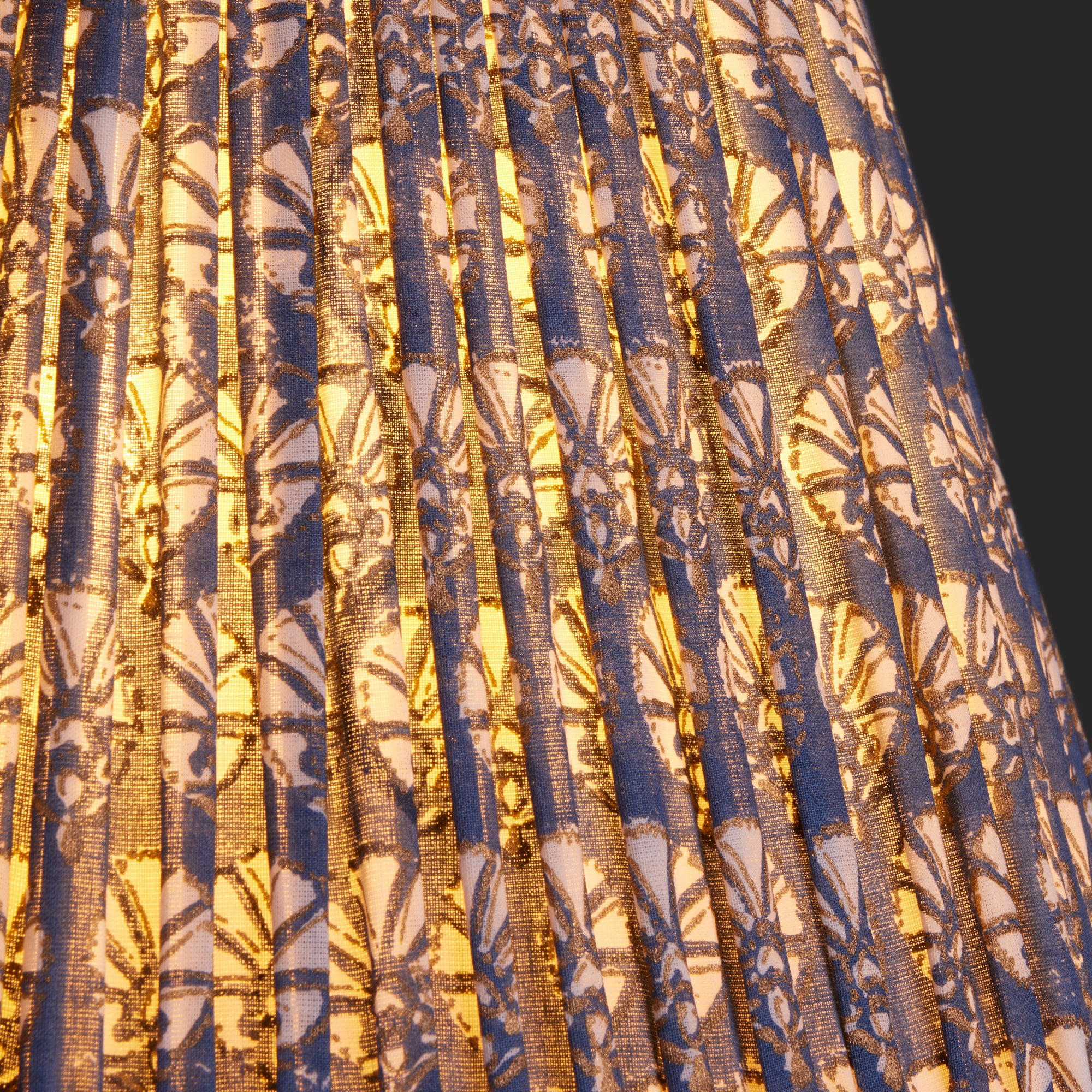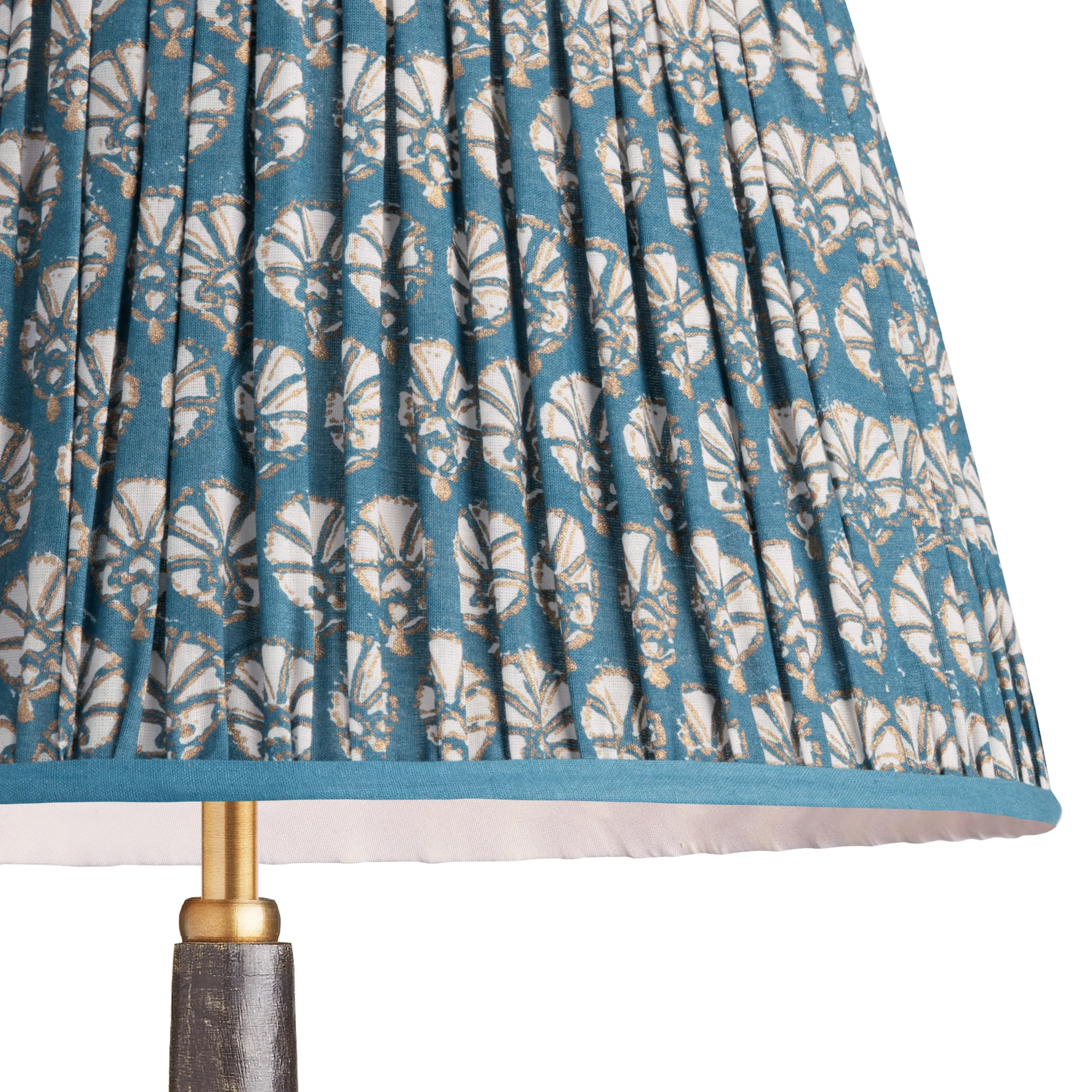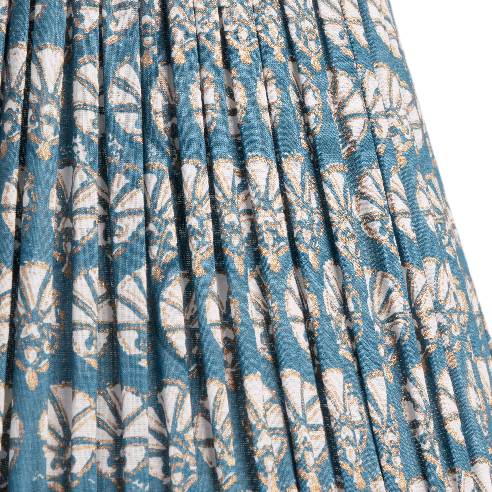 Our Dervish pattern is a classic shell-like fan, block printed for us by the heroic artisans of Jaipur. In an elegant blue, outlined in grey.