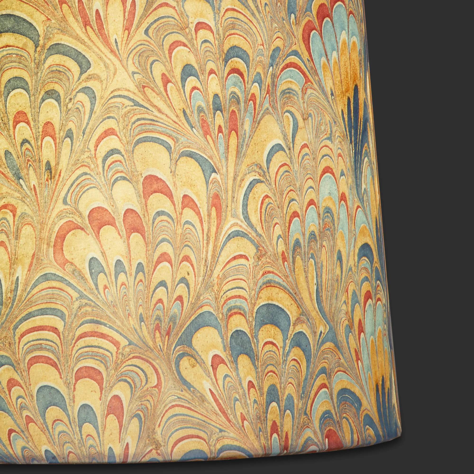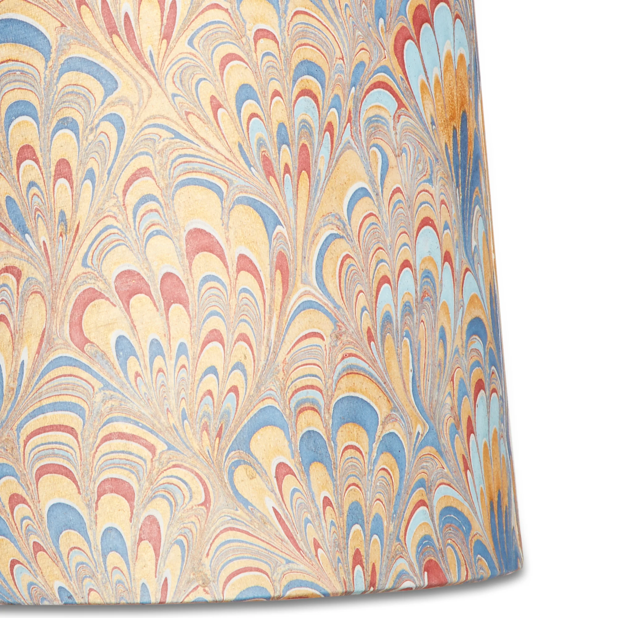 The marbling of paper is a craft that dates back hundreds of years, and it is fascinating to watch. Paints and oils are carefully dropped onto a thickened water, and are then raked and stretched to create the pattern. The paper is then slowly laid on top and once imprinted removed from the liquid and dried. No two pieces of paper can ever be the same. We are thrilled with these patterns - bold and brilliant. Please note that due to the smaller surface area required to create this effect this shade will have two seams