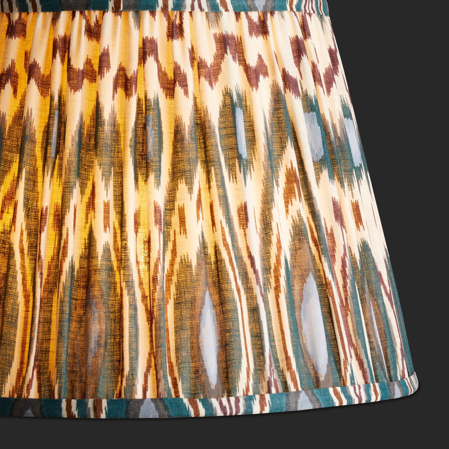 A gathered straight empire shade in a beautiful ikat pattern that we think borrows a few ideas from the colors of medieval heraldry - anyway, its rather lovely and it's hand-made from soft natural linen. With a warm cream fabric lining. Class.