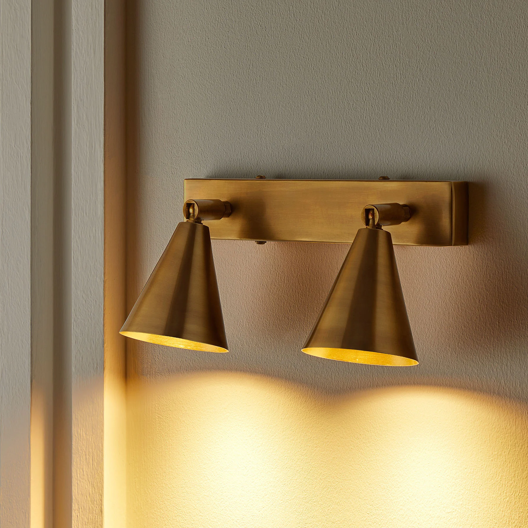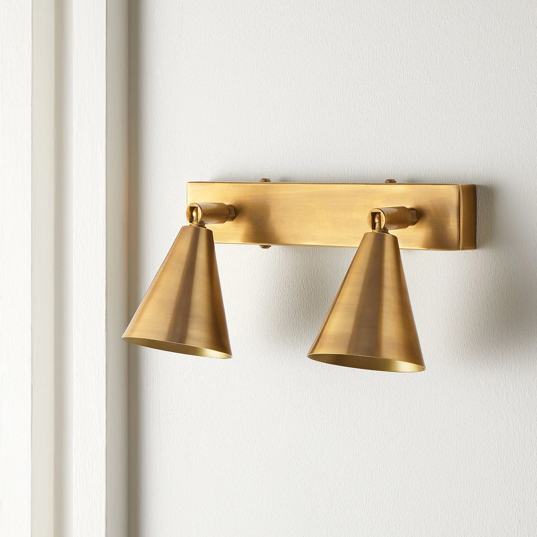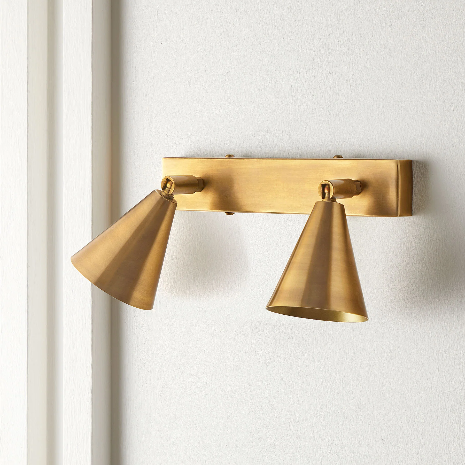 A double brass spotlight that gives a slightly more generous allocation of light than its cylindrical cousins. Multi-directional for full versatility any which way.
