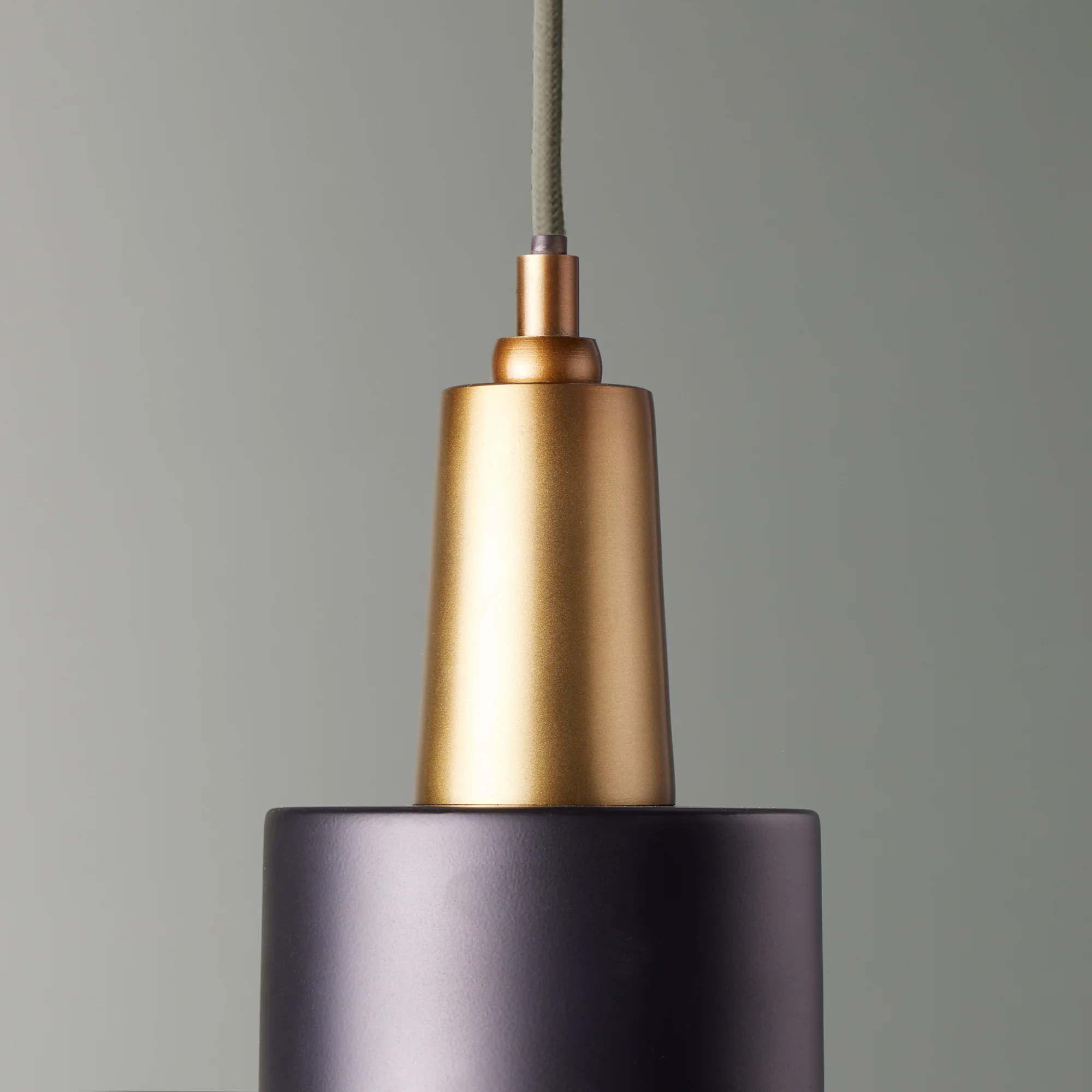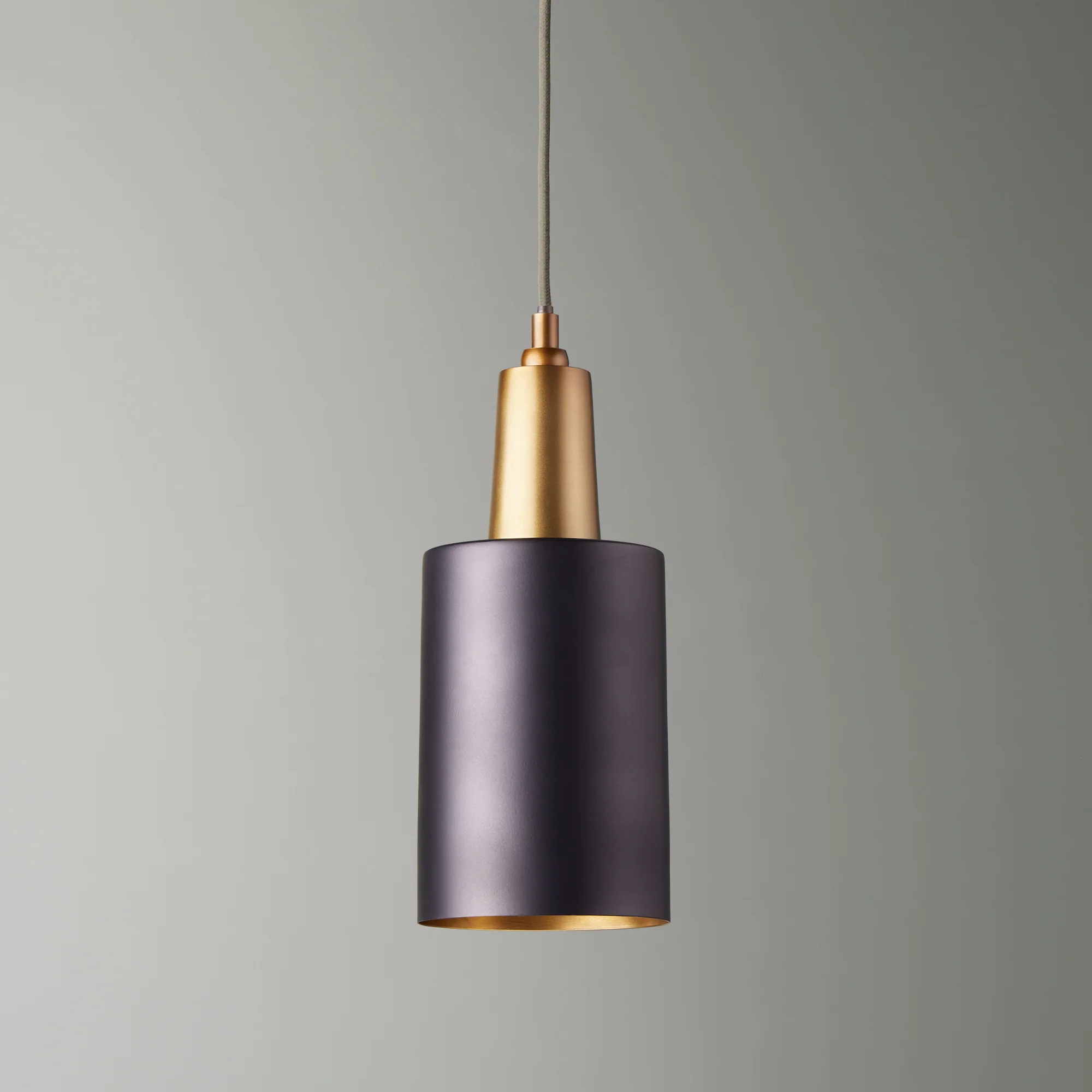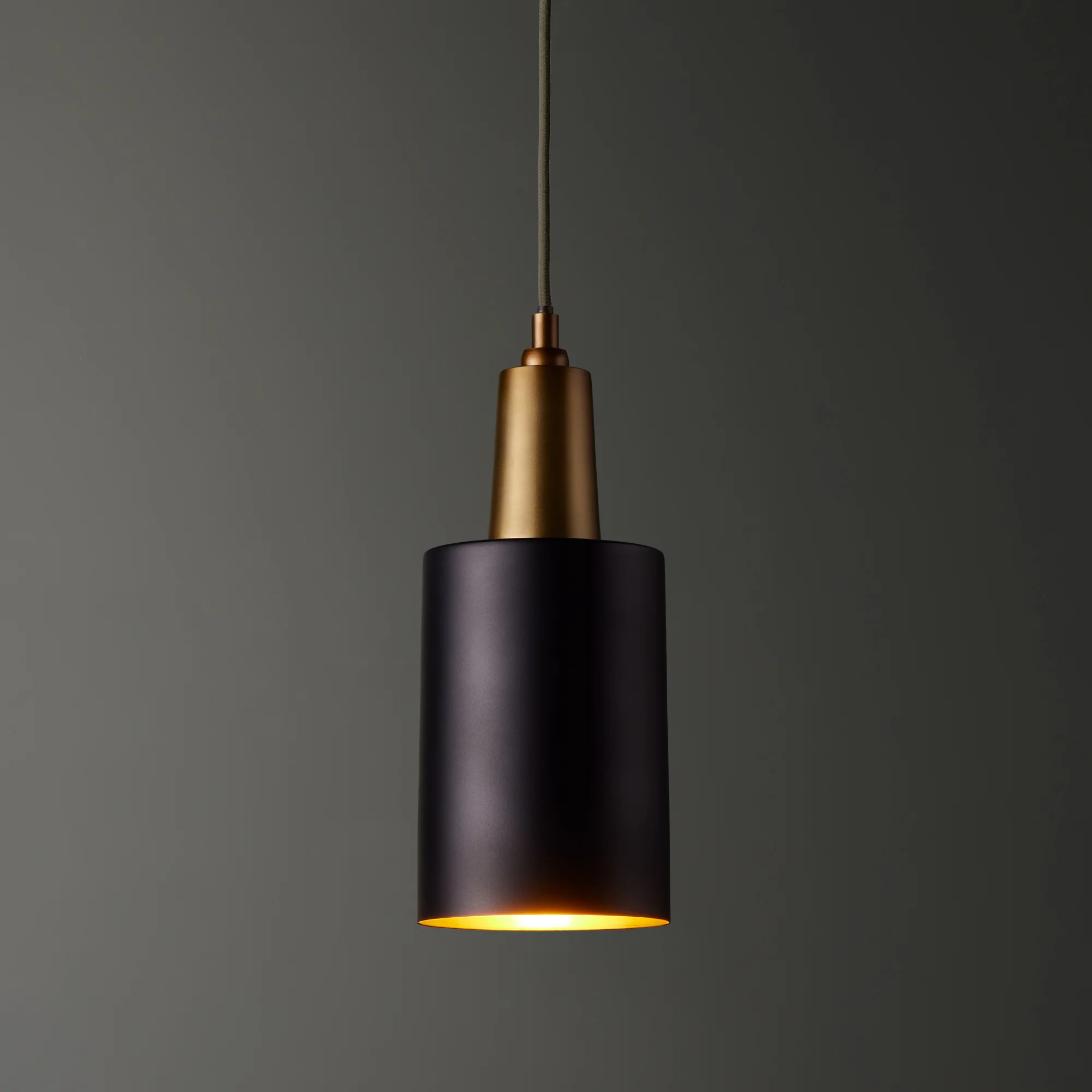 A tall thin cylindrical shape, with a tapered brass top. The gold interior throws out a lovely glow.