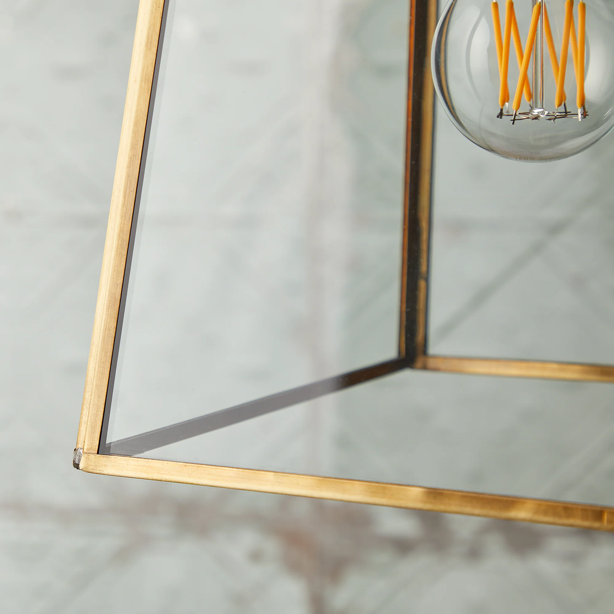 Simple glass pendant with sloped sides, all framed in gently antiqued brass work. The height of elegance.