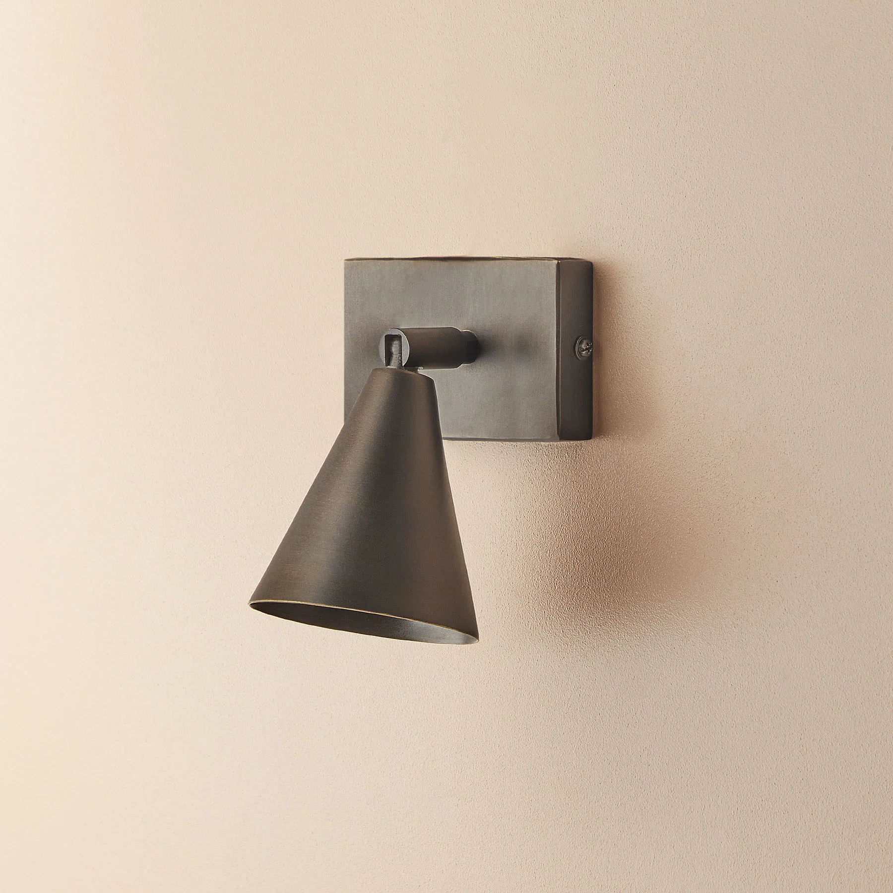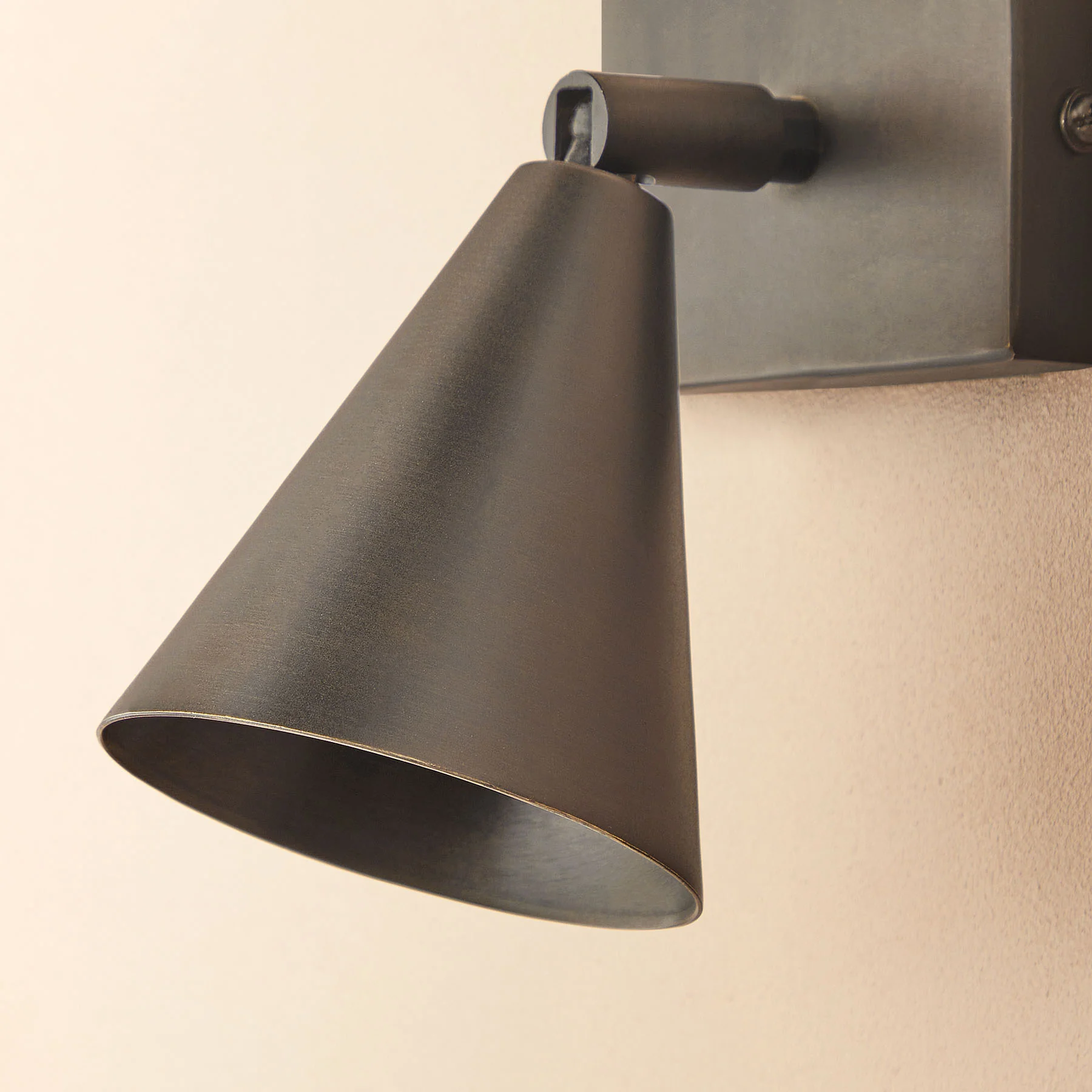 A simple brass spotlight with a bronze finish that gives a slightly more generous allocation of light than its cylindrical cousins. Multi-directional for full versatility any which way.