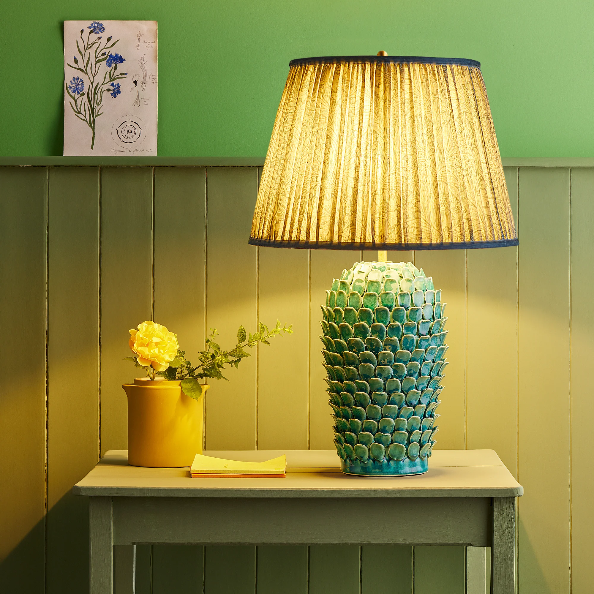 We called this very decorative table lamp Stucco somewhat by mistake. It probably had something to do with the fact that we have “stuck” “leaves” onto the outside of this elegant shape. We agonised for a long time in the design process over the size of the leaves, their spacing, and their number...and the exact tonal color. At least a year in the making and we are thrilled with the result. We hope you agree.